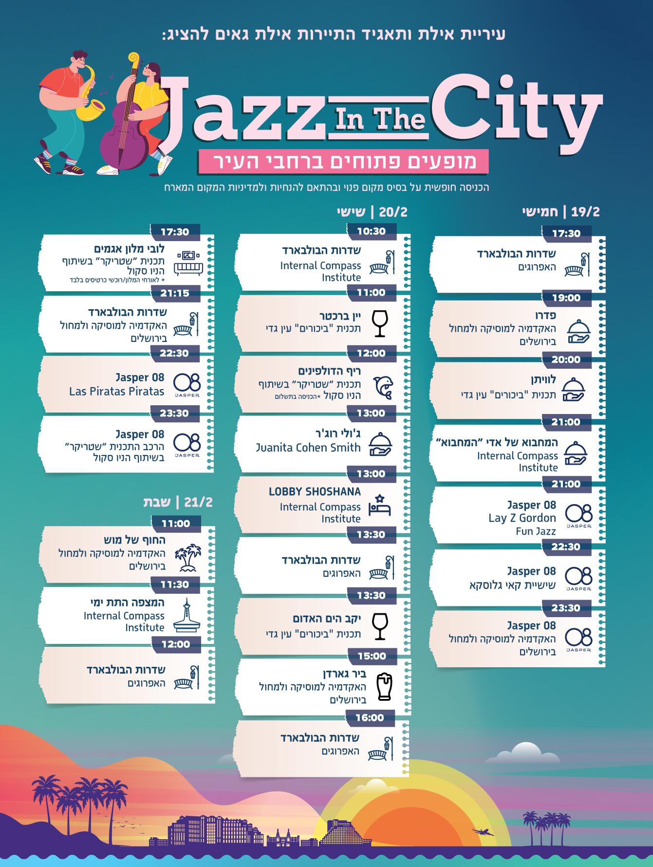 כבכל שנה, גם במהדורת החורף הקרובה המוזיקה תשטוף את אילת עם פרויקט "ג'אז והעיר": שורה של אירועים פתוחים לקהל הרחב, בשלל מיקומים בכל רחבי אילת (בחופים, בברים ואפילו במסעדות) עם הרכבים חיים ואווירת ג׳אז.